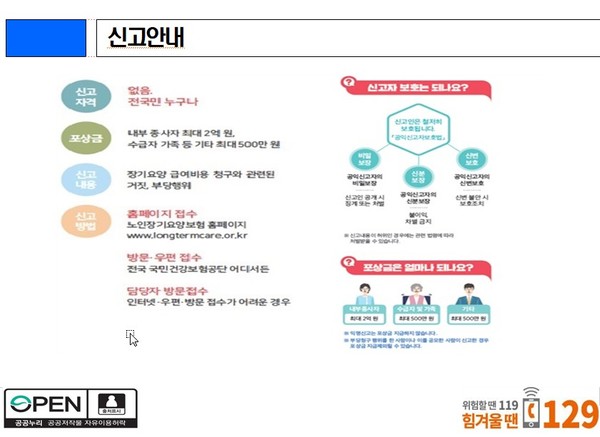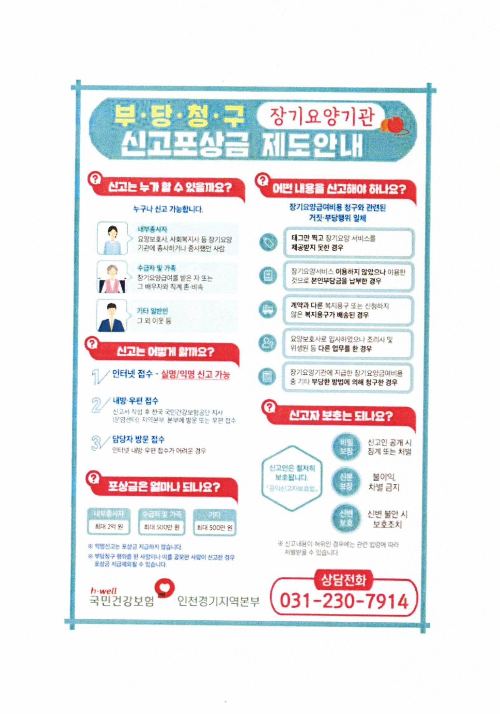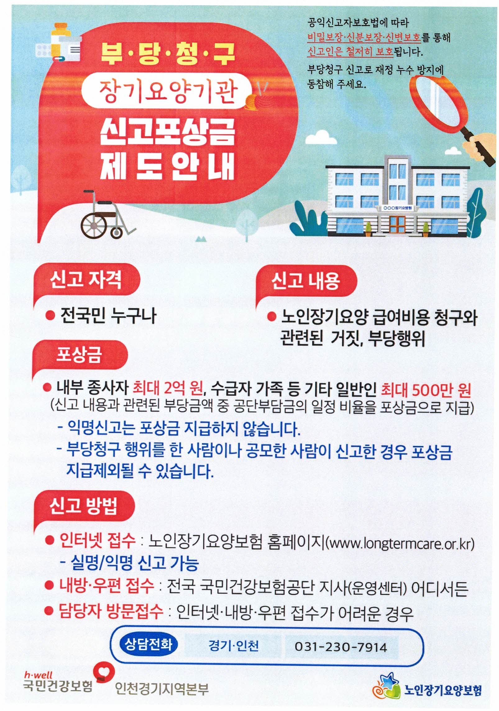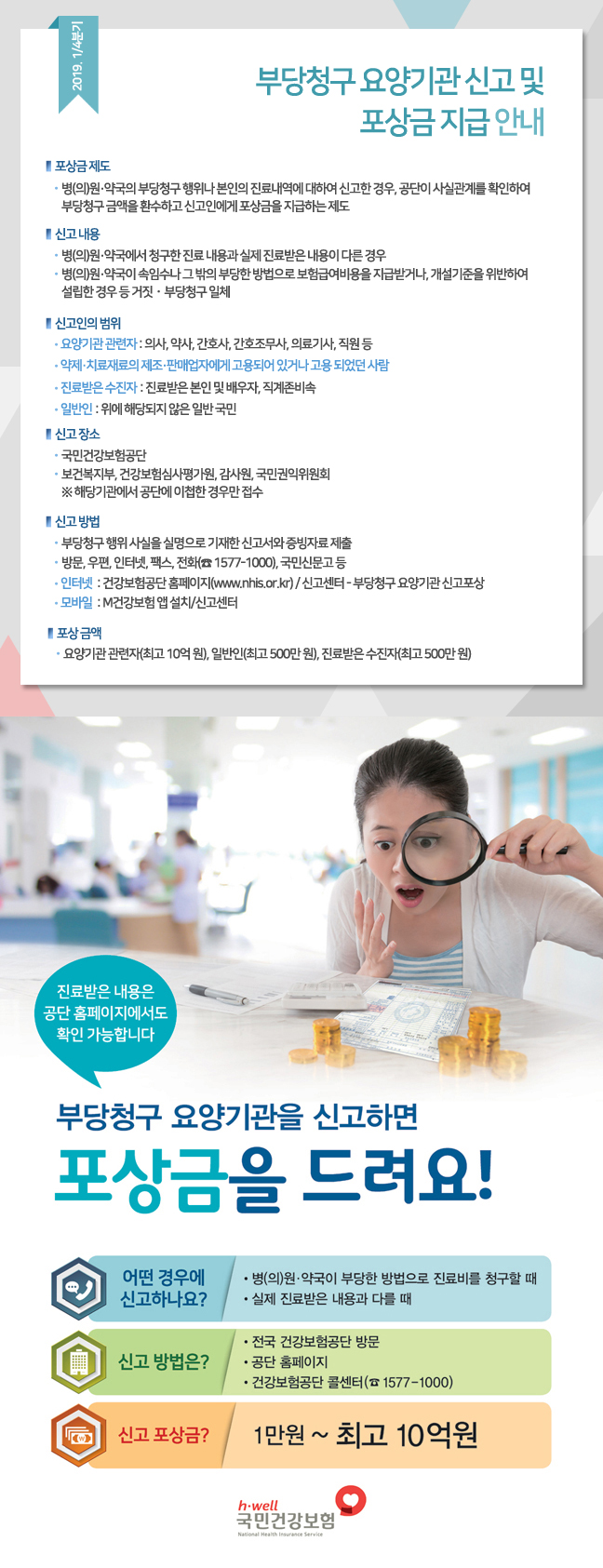 ■ 의료기관 부당청구 신고란 신고자가 부당청구 또는 요양기관 불법개설 신고를 한 경우 공단은 사실관계를 확인하고 부당한 청구금액을 환수하고 소정의 보상금을 신고자에게 지급합니다. ■ 신고범위 의료기관 관계자(의료기관 종사자, 제약·치료제 소재회사 종사자), 기타 신고자 ※ 의료기관 이용자의 경우 “진료수혜요령” 신고 내용 참조 ■법인 홈페이지 (www.nhis. or.kr), 모바일앱(건강보험), 우편, 방문신고방법(자료제출시 반드시 신고자 실명 기재), 포상금액이 가장 높은 의료기관 관계자(최대 2명) 10억원), 기타 제보자(최대 5억원)