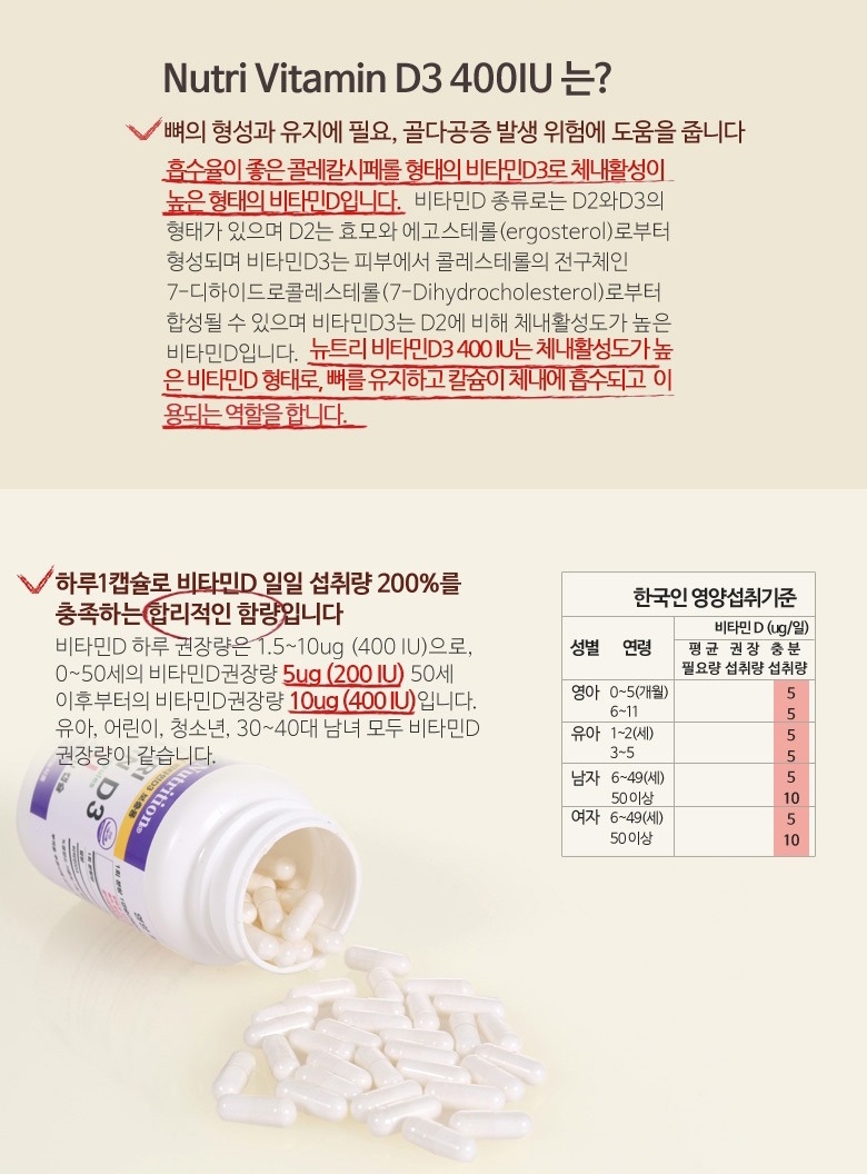 비타민D와 비타민Ks는 일상생활에서 꼭 필요한 영양소인데, 특히 추워지면 비타민D는 햇빛만으로는 충분히 채울 수 없기 때문에 비타민D영양제를 섭취하는 것이 좋지만 여기에 비타민K와 함께 섭취하시면 더욱 좋습니다!!적절한 칼슘 흡수로 뼈 건강과 치은강에 효과가 있어 건강한 면역체 유지에 도움을 주고 건강한 일상생활을 할 수 있습니다