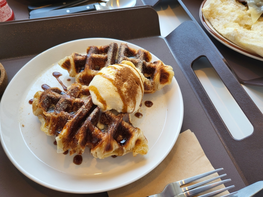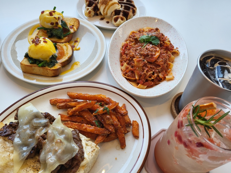 우리는 에그 베네딕트, 파파델 라구 파스타, 필리 치즈 샌드위치, 클래식 크로플을 주문했습니다.