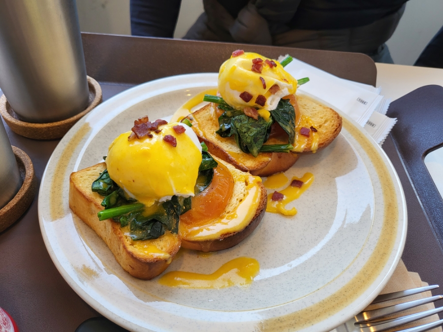 에그 베네딕트에서 흘러나오는 노른자를 보실 수 있습니다.