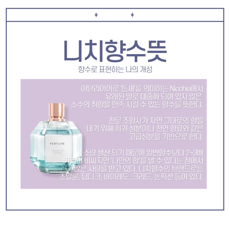 니치는 니치를 속이는 이탈리아어에서 파생된 말로 전문 조향사가 소수를 대상으로 만든다고 합니다. 향도 굉장히 많지만 사람들이 선호하는 향이 또 비슷하기도 해서 차별화된 향을 만들기 위해서 천연향료나 희귀성분 등 고급 원료를 사용하고 있습니다.