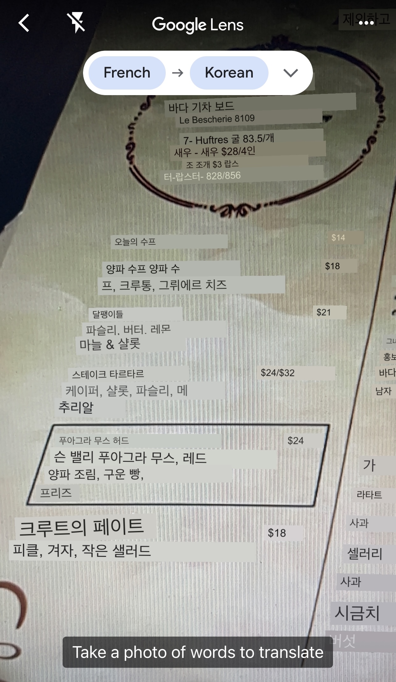 설명을 제외하면 메뉴가 대부분 프랑스어로 되어 있어서 오랜만에 언어장벽을 느낀 날이었다. 주문 방법을 몰라 고민하던 중 남편이 구글 이미지 번역 서비스를 이용하자고 제안했다. 언어를 입력해서 구글 번역기를 사용해봤는데 이미지 번역 기능은 처음이라 너무 신기했어요.